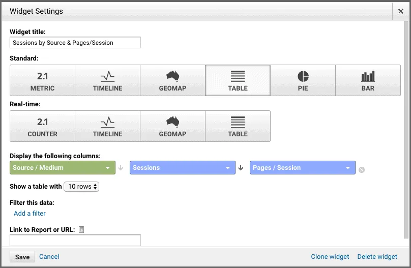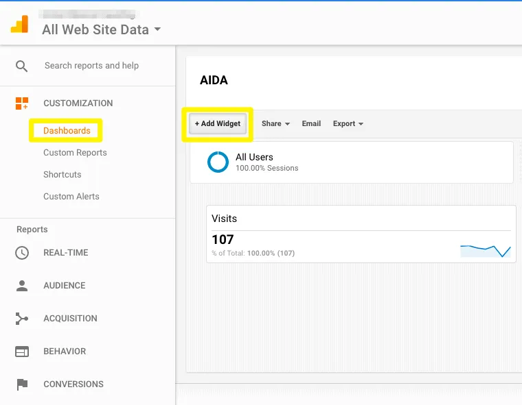 Open up Google Analytics and head over to the Dashboard section. You’ll see it under Customization (aka the part you always skip over). Once there, click on Add Widget.