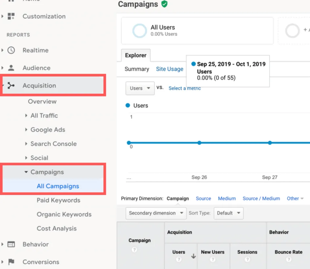 There are a few quick steps to take to start tracking your campaigns through Google Analytics. To start, log on to Google Analytics, then head to the “Acquisitions” page and click “Campaigns” and “All Campaigns.”