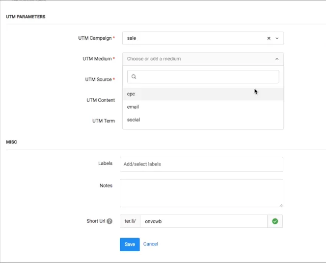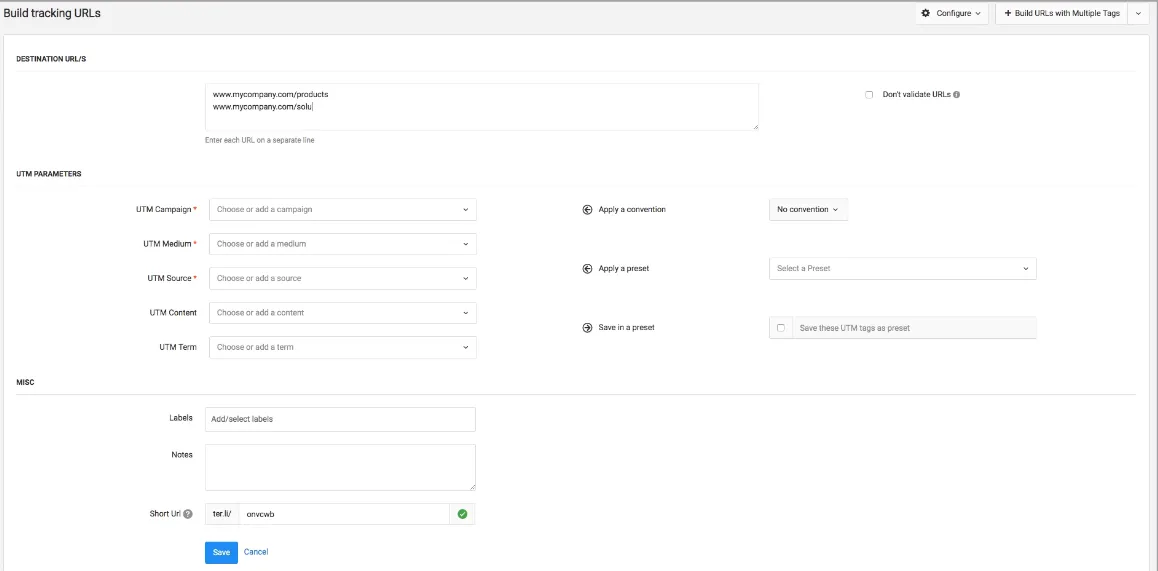 - Click save and voila! Your custom URLs are now ready. You can copy your short URL, or fully tagged link, as desired.